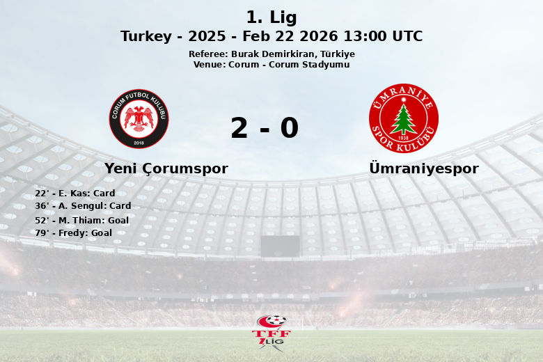 La première mi-temps a été tendue, avec deux cartons jaunes montrés aux joueurs de Yeni Çorumspor, E. Kas à la 22e minute et A. Sengul à la 36e minute. La deuxième mi-temps a vu l’ouverture du score, avec un but sur penalty de M. Thiam à la 52e minute en faveur de Yeni Çorumspor. À la 79e minute, Fredy a augmenté l’avantage pour l’équipe locale avec un but, après une passe décisive de M. Thiam.