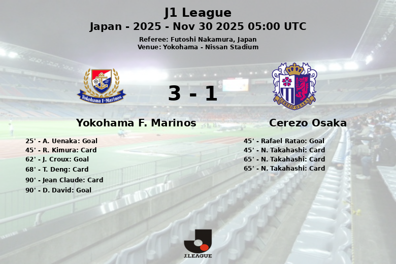 Yokohama, Japon – Yokohama F. Marinos a décroché une victoire cruciale contre Cerezo Osaka lors de la 37e journée de la J1 League au Nissan Stadium. Le match, arbitré par Futoshi Nakamura, a été marqué par l’intensité et plusieurs incidents qui ont influencé le déroulement du jeu.