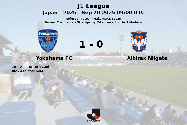Remplacements dans l’quipe de yokohama fc: À la 60e minute, H. Ogura est entré et Y. Lara est sorti., À la 69e minute, Lukian est entré et R. Kubota est sorti., À la 80e minute, A. Fukumori est entré et K. Shimbo est sorti., À la 80e minute, Joao Paulo est entré et Adailton est sorti.