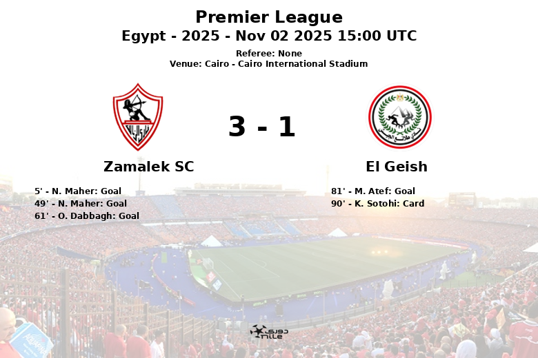 N. Maher a ouvert le score tôt, à la 5e minute, avec une excellente finition après une passe décisive de N. Dunga. Zamalek a continué à presser et N. Maher a de nouveau marqué à la 49e minute, augmentant l’avantage de son équipe. O. Dabbagh a scellé la victoire avec un but à la 61e minute, sur une passe de M. Bentayg. El Geish a réussi à réduire l’écart à la 81e minute grâce à un but de M. Atef, sur une passe de G. Al Madadha, mais cela n’a pas suffi à changer le cours du match.