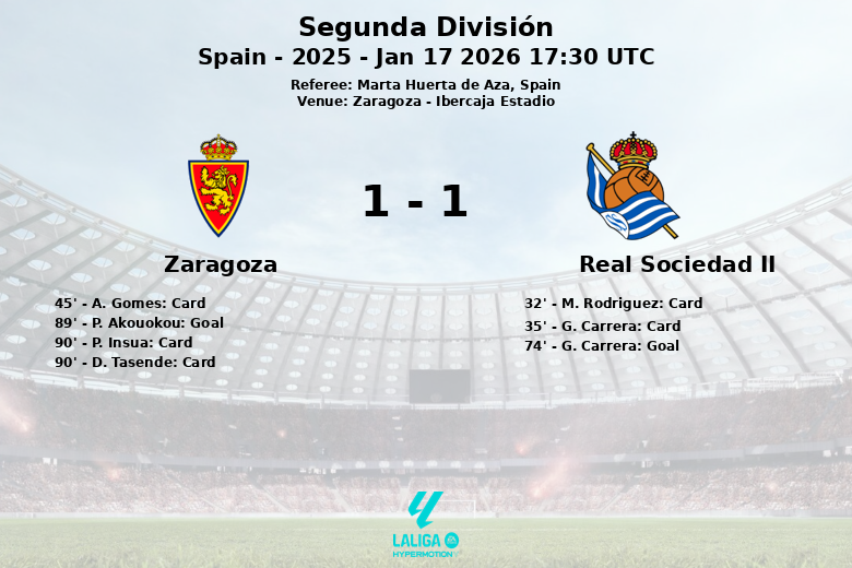 Saragosse a dominé la possession en première mi-temps avec 57 %, mais a eu du mal à la traduire en buts. Real Sociedad II a cherché des opportunités en contre-attaque. Les cartons jaunes pour M. Rodriguez et G. Carrera de Real Sociedad II, et A. Gomes de Saragosse, ont souligné la bataille au milieu de terrain.