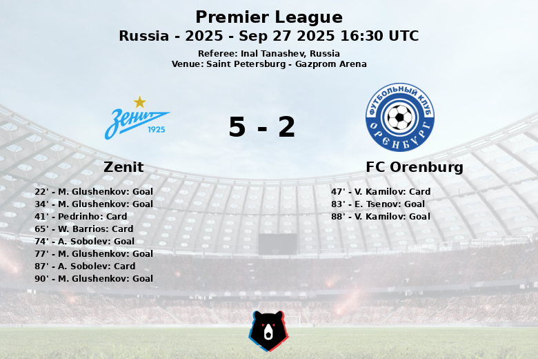 Après la pause, le Zénith n’a pas ralenti. A. Sobolev a creusé l’écart à la 74e minute, et Glushenkov a complété son triplé à la 77e minute. Le FC Orenbourg a tenté de réagir avec des buts de E. Tsenov à la 83e minute et V. Kamilov à la 88e minute, mais cette poussée n’a pas suffi. Kamilov a également reçu un carton jaune à la 47e minute, et Sobolev du Zénith a reçu un carton jaune à la 87e minute.