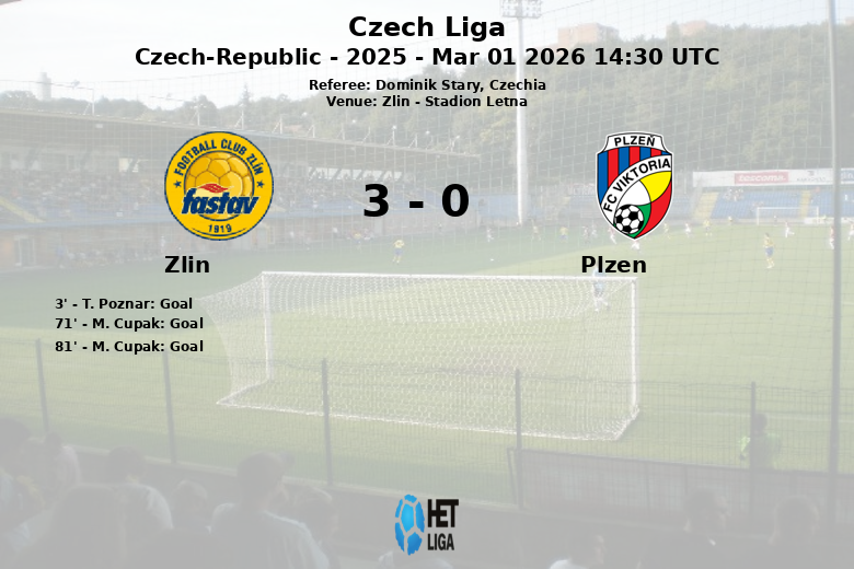 Remplacements dans l’quipe de zlin: À la 30e minute, J. Kolar est entré et J. Cernin est sorti., À la 46e minute, S. Petruta est entré et M. Pisoja est sorti., À la 67e minute, D. Machalik est entré et M. Koubek est sorti., À la 67e minute, T. Poznar est entré et M. Cupak est sorti., À la 86e minute, J. Didiba est entré et J. Pesek est sorti.