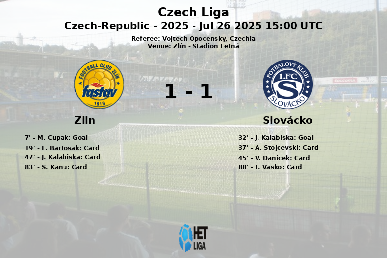 Remplacements dans l’quipe de zlin: À la 56e minute, J. Kalabiska est entré et J. Kolar est sorti., À la 56e minute, T. Poznar est entré et S. Kanu est sorti., À la 63e minute, M. Kopecny est entré et R. Ovesny est sorti., À la 63e minute, C. Nombil est entré et S. Petruta est sorti., À la 88e minute, J. Didiba est entré et T. Ulbrich est sorti.