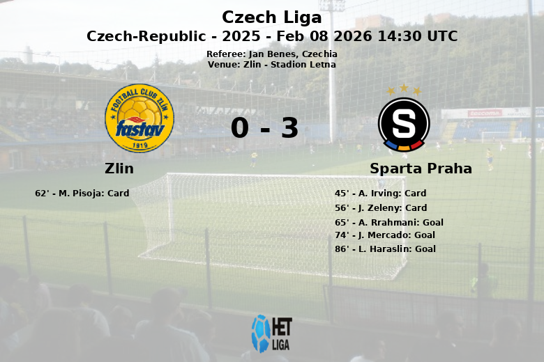 Zlin a tenté de réagir, mais sa possession limitée et la solidité défensive du Sparta Prague l’ont empêché de se créer des occasions de but claires. Avec cette victoire, le Sparta Prague réaffirme sa position comme l’un des prétendants au titre en Ligue Tchèque. L’arbitre Jan Benes a dirigé le match sans incidents majeurs.