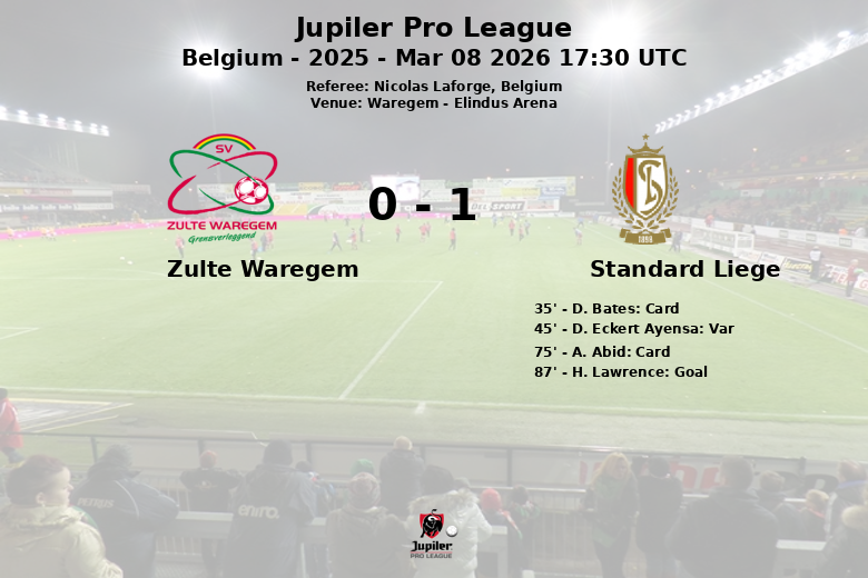 Waregem, Belgique – Dans un match tendu et disputé à l’Elindus Arena, le Standard de Liège a réussi à s’imposer face à Zulte Waregem grâce à un but tardif de H. Lawrence. Le match, comptant pour la 28e journée de la Jupiler Pro League, a été un affrontement équilibré, où la possession a été répartie de manière presque égale, avec 51 % pour le Standard de Liège et 49 % pour Zulte Waregem.