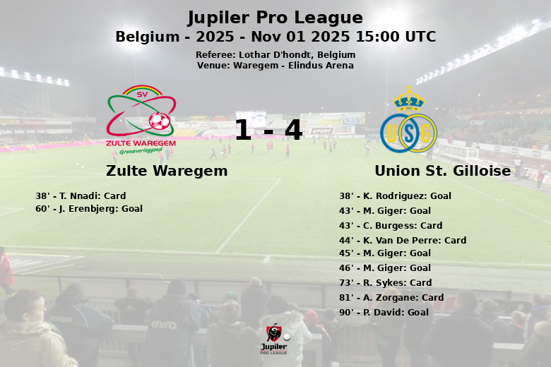 La deuxième mi-temps a débuté par un but rapide de M. Giger, creusant l’écart pour l’Union Saint-Gilloise. Zulte Waregem a réagi et a réussi à réduire l’écart grâce à un penalty transformé par J. Erenbjerg à la 60e minute. Le match a continué à un rythme élevé, les deux équipes cherchant à marquer. L’Union Saint-Gilloise a scellé la victoire avec un but de P. David à la 90e minute, servi par R. Schoofs.