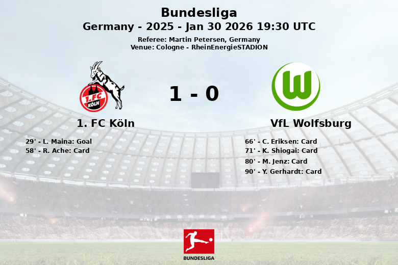 Cologne, Germany – 1. FC Köln secured a victory at home against VfL Wolfsburg in a hard-fought match at the RheinEnergieSTADION. The only goal of the game came in the 29th minute, scored by L. Maina, assisted by T. Krauss, sparking jubilation among the home fans.