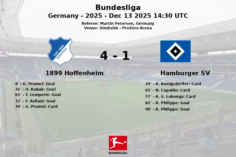 Hamburger SV found some consolation at the end of the match. R. Philippe pulled one back in the 82nd minute, assisted by F. Vieira, and again in the 90th minute, despite missing a penalty. The match ended 4-2, reflecting Hoffenheim’s superiority, who had 6 shots on target compared to Hamburger SV’s 5. A. S. Lokonga received a yellow card in the 77th minute. Referee Martin Petersen oversaw the match, which had 15 fouls by Hoffenheim and 10 by Hamburger.