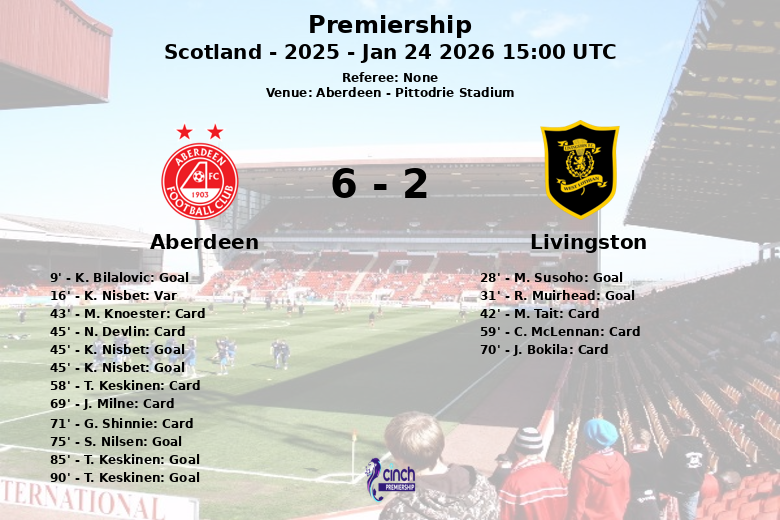 The match began with Aberdeen dominating possession (62%), although it was Livingston who struck first with goals from M. Susoho and R. Muirhead. Previously, Aberdeen had scored at 9′ through K. Bilalovic, but a goal by K. Nisbet was disallowed for offside in the 16th minute. However, before halftime, Nisbet redeemed himself with two goals that tied the score.