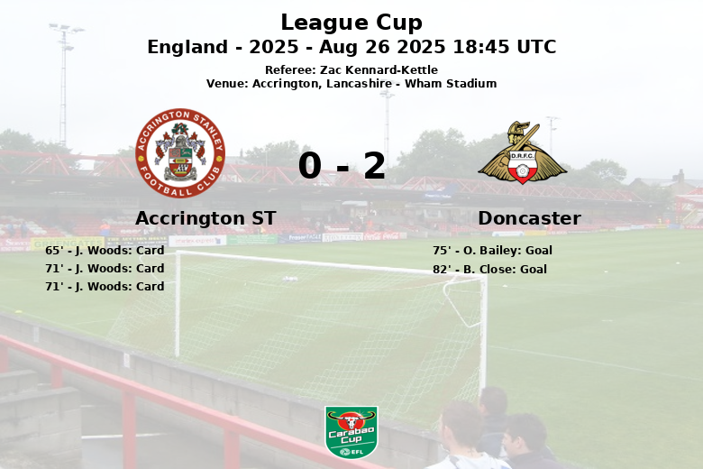 Accrington, Lancashire – Doncaster secured a 2-0 victory over Accrington Stanley at the Wham Stadium in the second round of the League Cup, in a match largely controlled by the visitors. Referee Zac Kennard-Kettle had a busy afternoon, culminating in the sending off of Accrington ST’s J. Woods.
