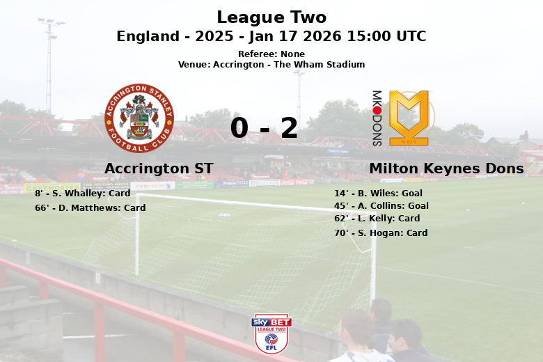 The match was characterized by a hard-fought game in midfield, reflected in the 12 fouls committed by each team. The referee also showed yellow cards to S. Whalley of Accrington ST in the 8th minute, L. Kelly in the 62nd minute and S. Hogan in the 70th minute for Milton Keynes Dons, in addition to D. Matthews of Accrington ST in the 66th minute.