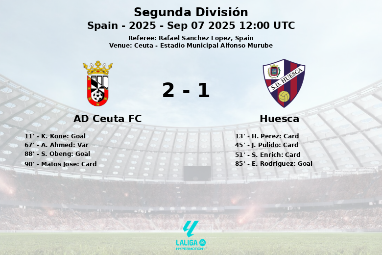 The referee, Rafael Sanchez Lopez, had a controversial performance, showing yellow cards to H. Perez, J. Pulido and Matos Jose, in addition to the red card to S. Enrich. A goal by A. Ahmed was disallowed by VAR for offside in the 67th minute. Ceuta had 14 shots (4 on target) and Huesca 5 (1 on target). Ceuta had 8 corners in their favour and Huesca none.