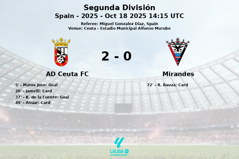 The match began with an early goal from Matos Jose in the 5th minute, assisted by K. Kone, giving Ceuta the lead. Mirandés attempted to react, but encountered a well-organized defense and a Ceuta determined to extend their advantage. The first half also saw a yellow card for Jamelli of Ceuta.