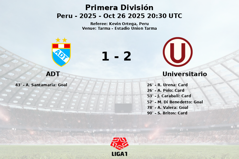 In a hard-fought match at the Estadio Unión Tarma, Universitario secured an important away victory against ADT in matchday 16 of the Clausura tournament of the Peruvian Primera División. The match, refereed by Kevin Ortega, was intense and marked by cards.