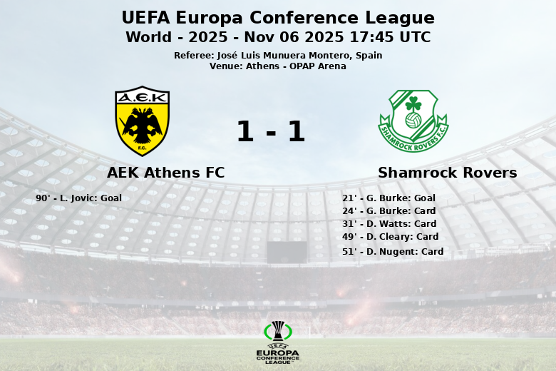 Shamrock Rovers, with ball possession limited to 20% and only one shot on goal throughout the match, managed to take the lead thanks to a penalty converted by G. Burke in the 21st minute. The Irish team was forced to commit 11 fouls and received four yellow cards (G. Burke, D. Watts, D. Cleary, and D. Nugent) as a reflection of their defensive strategy. AEK Athens, despite their control of the game, only committed 8 fouls and received no yellow cards.