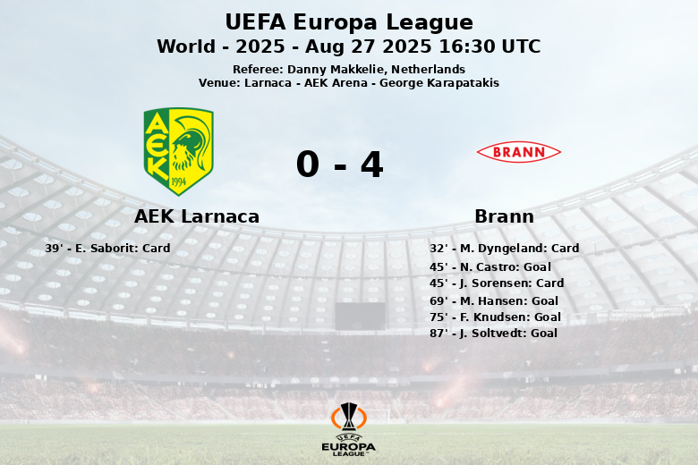 AEK Larnaca, despite having more ball possession, failed to trouble the opposing goalkeeper, with none of their nine shots on target. Brann, on the other hand, demonstrated great effectiveness, converting four of their six shots on target into goals. The tie will be decided in the return leg, where AEK Larnaca will have to perform a heroic feat to overcome this hefty scoreline.