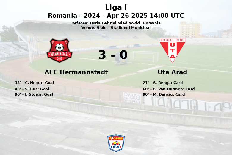 AFC Hermannstadt convincingly defeated Uta Arad 3-0 in a match played at the Stadionul Municipal in Sibiu, Romania. The game, part of the Liga I relegation round, saw Uta Arad hold more possession (53%) but ultimately lacked the finishing touch.