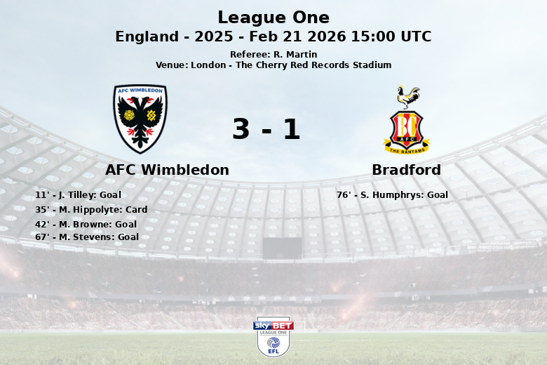 London, England – In a vibrant match played at The Cherry Red Records Stadium, AFC Wimbledon defeated Bradford in a game corresponding to matchday 34 of League One. Referee R. Martin witnessed a duel where the home team secured the victory with a score that reflected their effectiveness in front of goal.