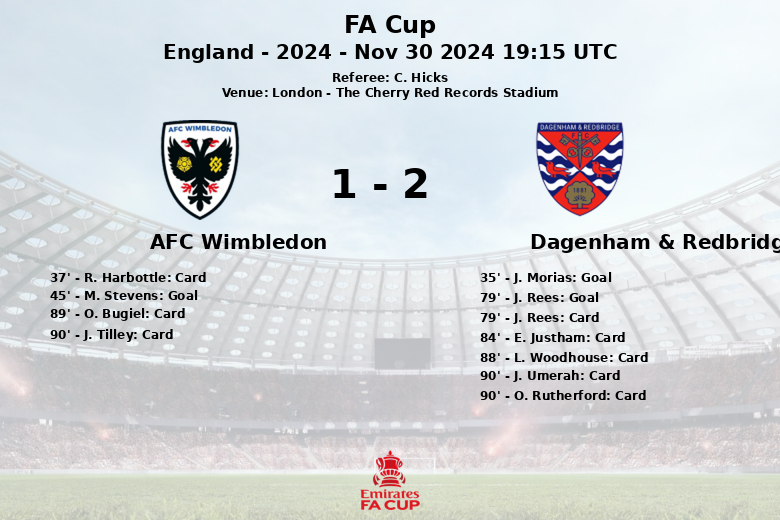 London, November 30, 2024 – The FA Cup second round clash between Dagenham & Redbridge and AFC Wimbledon at The Cherry Red Records Stadium in London ended in a thrilling draw. The match, refereed by C. Hicks, was marked by goals at both ends and a flurry of yellow cards in the closing stages.
