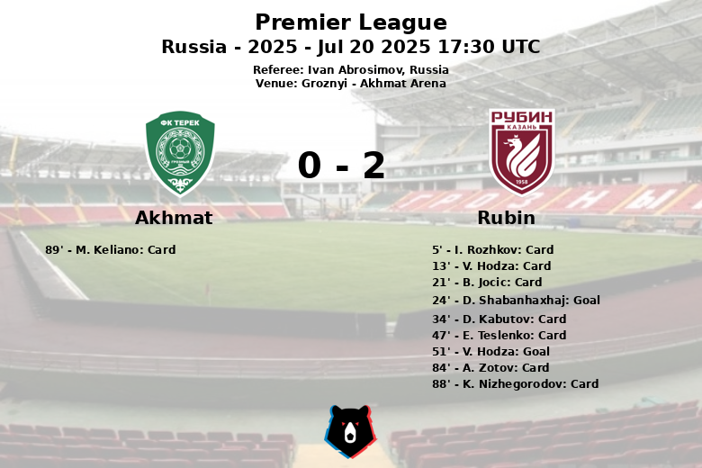 Groznyi, Russia – In a hard-fought match held at the Akhmat Arena, Rubin Kazan secured a valuable victory over Akhmat Grozny on the opening day of the Russian Premier League. The game, characterized by high intensity and numerous fouls, ended with a final score of 2 to 0 in favor of Rubin.
