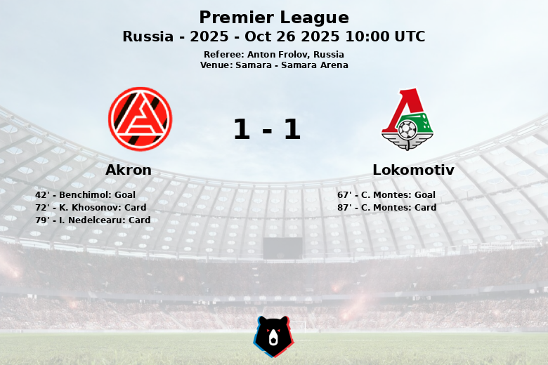 A tactical encounter at the Samara Arena saw Akron and Lokomotiv draw one apiece. Despite the difference in possession, with Lokomotiv dominating with 65% compared to Akron’s 35%, the game was balanced in terms of opportunities. Benchimol put Akron ahead in the 42nd minute with a goal that sparked joy on the home bench. Lokomotiv, showing greater attacking ambition with 11 shots, although only three on target, fought to equalize. Lokomotiv’s persistence finally paid off in the 67th minute, when C. Montes scored, leveling the score. Akron, with fewer shots but greater effectiveness, defended tooth and nail to maintain the draw. The match was intense, reflected in the 17 fouls committed by Akron and 11 by Lokomotiv, resulting in two yellow cards for Akron and one for Lokomotiv. In the end, the one-all draw reflected a game where Akron’s effectiveness contrasted with Lokomotiv’s territorial dominance.