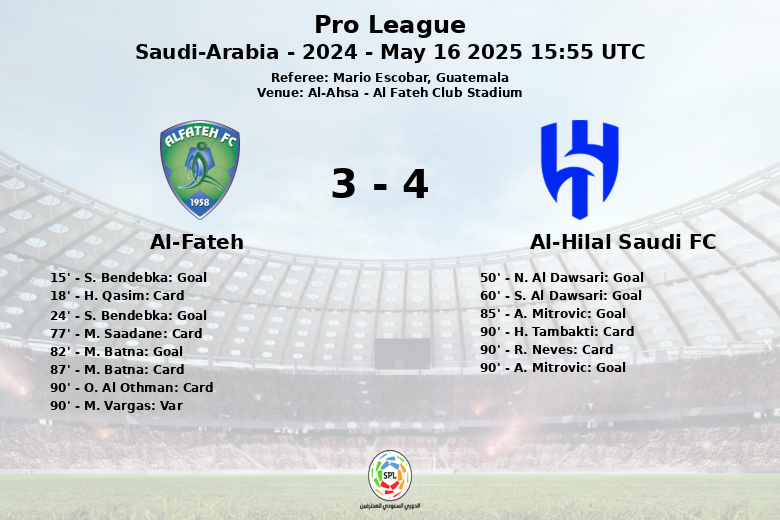 Al-Ahsa, Saudi Arabia – Al-Hilal Saudi FC mounted a stunning comeback to defeat Al-Fateh 5-3 in a thrilling match at the Al Fateh Club Stadium, marking their 32nd game of the Pro League season. The match, officiated by Guatemalan referee Mario Escobar, was a rollercoaster of emotions from start to finish.