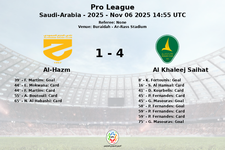 Buraidah, Saudi Arabia – Al Khaleej Saihat secured an important victory against Al-Hazm in a match filled with excitement and numerous cards at the Ar-Rass Stadium for the eighth round of the Pro League. The game, played on November 6, 2025, was marked by intensity and an abundance of cautions.