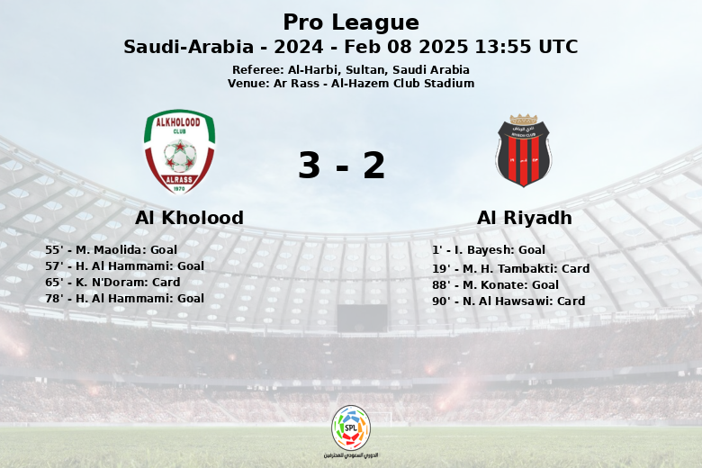 Al Kholood staged a thrilling comeback against Al Riyadh in a vibrant match played at the Al-Hazem Club Stadium in Ar Rass. Al Riyadh took an early lead with a goal from I. Bayesh in the 1st minute, assisted by Lucas Kal. However, Al Kholood overturned the scoreline in the second half with goals from M. Maolida in the 55th minute (assisted by M. Sawan) and H. Al Hammami in the 57th minute (assisted by M. Sawan). Al Hammami scored again in the 78th minute, sealing the victory for Al Kholood. M. Konate pulled one back for Al Riyadh in the 88th minute. The match ended 3-2 in favor of Al Kholood. Both teams displayed great intensity, with Al Riyadh committing 21 fouls and Al Kholood 8. Al Kholood had a slight possession advantage (53%), but Al Riyadh had more shots (17 against 13). A total of three yellow cards were shown, two to Al Riyadh and one to Al Kholood.