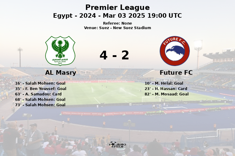 Future FC took the lead in the 10th minute with a goal from M. Helal. However, AL Masry responded quickly, equalizing in the 16th minute thanks to a goal from Salah Mohsen. Before the break, F. Ben Youssef scored a penalty to put AL Masry ahead (2-1).