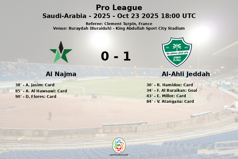 The only goal of the match came in the 34th minute, scored by F. Al Buraikan, who took advantage of a play to put Al-Ahli Jeddah ahead. Despite the dominance of Al-Ahli Jeddah, Al Najma tried to create danger but lacked precision in their shots, failing to direct any shots on target.