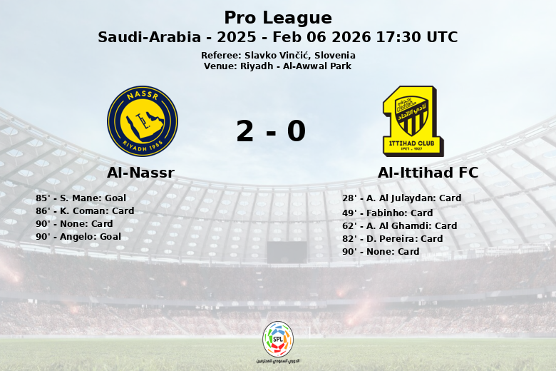 Riyadh, Saudi Arabia – In a tightly contested match at Al-Awwal Park in Riyadh, Al-Nassr emerged victorious against Al-Ittihad in a game marked by intensity and a high number of yellow cards. Slovenian referee Slavko Vinčić had a busy night, issuing a total of five yellow cards to Al-Ittihad players and two to Al-Nassr players.