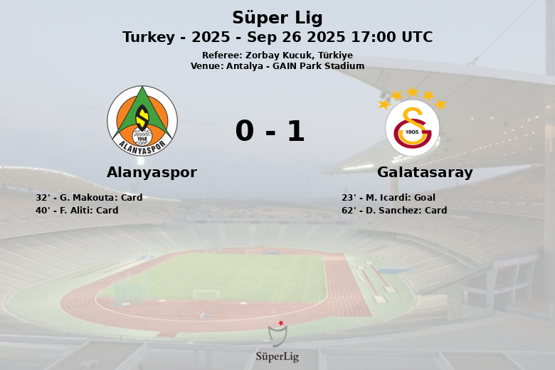 Antalya, Turkey – Galatasaray defeated Alanyaspor at the GAIN Park Stadium in a match corresponding to the seventh round of the Süper Lig. The match, overseen by referee Zorbay Kucuk, was decided by a goal from Mauro Icardi in the 23rd minute, assisted by W. Singo.