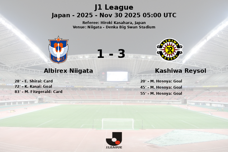 Niigata – Kashiwa Reysol powerfully defeated Albirex Niigata at the Denka Big Swan Stadium, thanks to an inspired performance by their striker M. Hosoya, who scored a hat-trick. Reysol’s dominance, reflected in 56% possession, translated into a constant siege on the rival goal. Hosoya opened the scoring in the 20th minute with an individual play that ended with a precise shot. Before halftime, in the 45th minute, Hosoya himself extended the lead with an assist from Y. Koizumi, making the match an uphill battle for the home side.