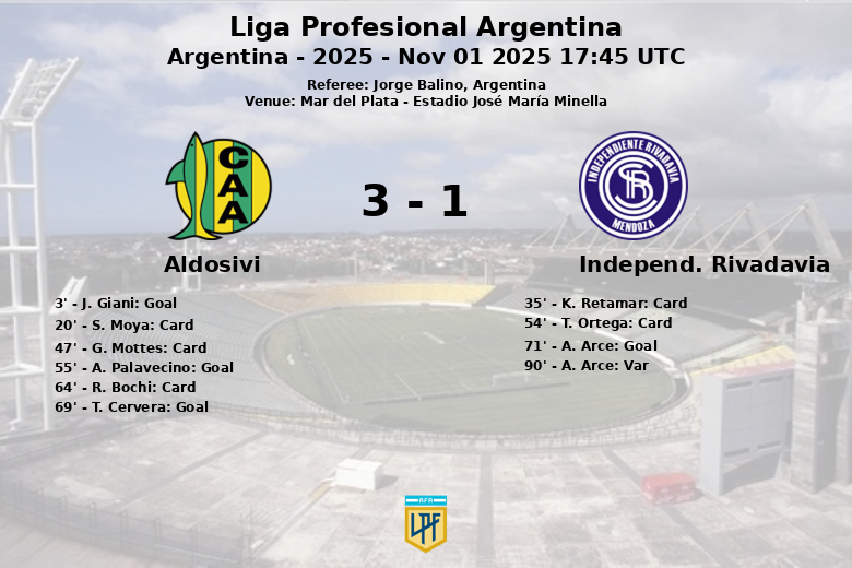 In the 55th minute, A. Palavecino extended Aldosivi’s lead, assisted by G. Mottes, consolidating the home team’s dominance. However, Independiente Rivadavia did not give up and sought to close the gap. T. Cervera scored the third goal for Aldosivi in the 69th minute, assisted by J. Giani. Despite A. Arce scoring for Independiente Rivadavia in the 71st minute, assisted by M. Bergara, the away team failed to reverse the situation. A goal by A. Arce was disallowed by VAR in the 90th minute due to offside.
