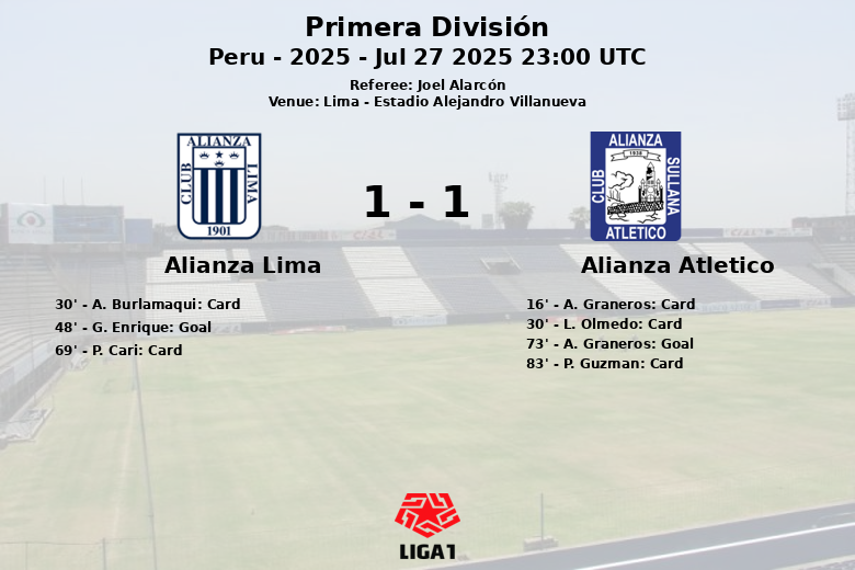 The first goal of the match came in the 48th minute, scored by G. Enrique for Alianza Lima. This goal seemed to give the home team the definitive advantage. However, Alianza Atlético reacted and, in the 73rd minute, A. Graneros equalized the score after an assist from J. C. Villegas, sealing the draw.