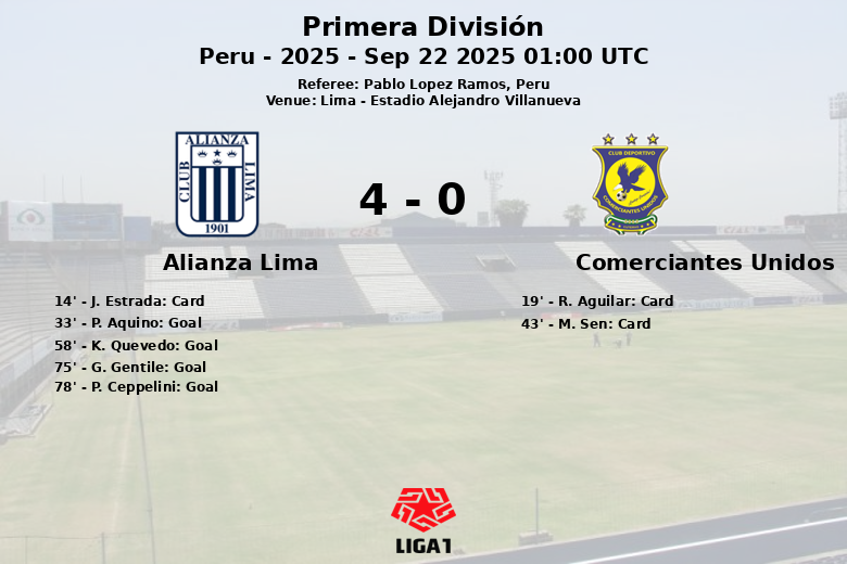 In the second half, Alianza Lima extended their lead with goals from Kevin Quevedo in the 58th minute, followed by goals from Gentile in the 75th minute and Ceppelini in the 78th minute, with an assist from Quevedo this time.