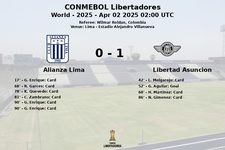 Despite Alianza Lima’s dominance in possession (59%), Libertad Asuncion proved more clinical in front of goal. The only goal of the game arrived in the 52nd minute, courtesy of G. Aguilar, assisted by H. Martinez.