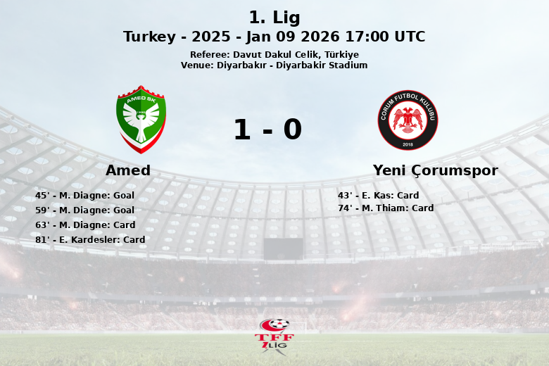 The scoring was opened on the stroke of halftime, in the 45th minute, with a goal by M. Diagne following an assist from M. Ucar. Diagne himself had the opportunity to extend the lead at the start of the second half, but missed a penalty in the 59th minute. Yeni Çorumspor, despite having more of the ball, only managed one shot on target, reflecting the defensive solidity shown by Amed.