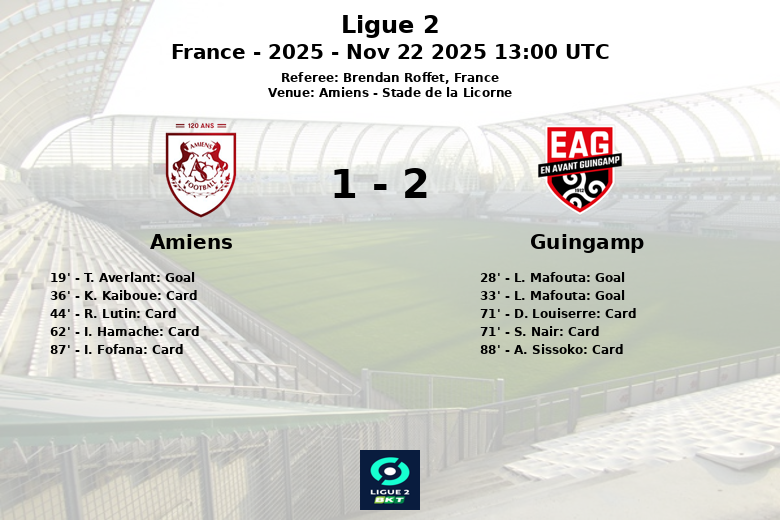 L. Mafouta emerged as the key player for Guingamp, scoring a penalty in the 28th minute and a field goal in the 33rd minute, assisted by D. Gomis, thus turning the score around. The match was characterized by high intensity, reflected in the numerous yellow cards shown by referee Brendan Roffet, with four cautions for Amiens (K. Kaiboue, R. Lutin, I. Hamache, I. Fofana) and three for Guingamp (D. Louiserre, S. Nair, A. Sissoko).