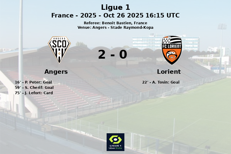 P. Peter opened the scoring for Angers in the 16th minute, thanks to an assist from A. Sbai. Lorient had the opportunity to equalize in the 22nd minute, but A. Tosin missed a penalty. In the second half, S. Cherif extended Angers’ lead in the 59th minute with a goal assisted by Y. Belkhdim.