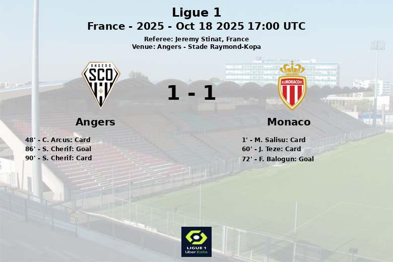 The first half went scoreless, but with a yellow card for Salisu of Monaco in the first minute. The second half saw more action. Arcus of Angers received a yellow card in the 48th minute, followed by Teze of Monaco in the 60th minute.