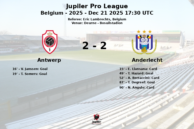 Antwerp took an early lead, with V. Janssen scoring from a penalty in the 16th minute. Three minutes later, T. Somers extended the lead with a goal after an assist from C. Scott, making the score 2 to 0. Anderlecht reacted in the second half, with T. Hazard also scoring from a penalty in the 49th minute. The match remained even and hard-fought until, in the 87th minute, T. Degreef equalized the score with a goal that sealed the draw.