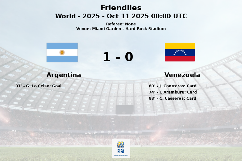 Miami Garden, EEUU – La selección argentina se impuso a Venezuela en un partido amistoso disputado en el Hard Rock Stadium el 11 de octubre de 2025. El único tanto del encuentro llegó al minuto 31 gracias a un gol de G. Lo Celso, asistido por L. Martinez.