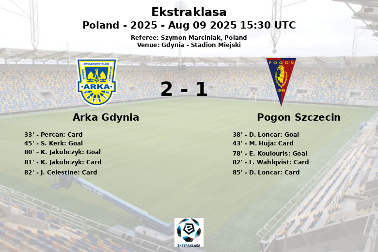 The second half remained vibrant. Although Pogon Szczecin had the opportunity to regain the lead with a penalty in the 78th minute, E. Koulouris missed the shot. Arka Gdynia took advantage of this momentum and K. Jakubczyk scored the goal that gave them the victory in the 80th minute.