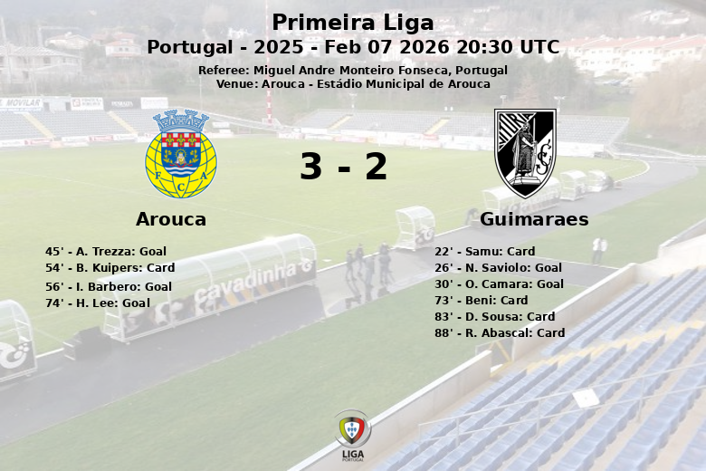 In a hard-fought match at the Estádio Municipal de Arouca, Guimaraes and Arouca played to a draw in an action-packed and goal-filled encounter. Guimaraes showed early strength, with N. Saviolo opening the scoring in the 26th minute, followed by a goal from O. Camara in the 30th. However, Arouca responded before halftime with a goal from A. Trezza in the 45th minute.