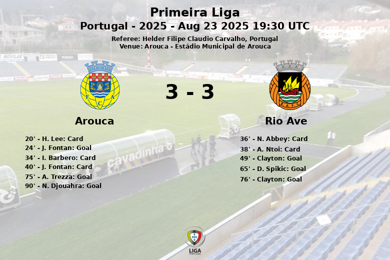 The match continued at a frenetic pace. A. Trezza scored for Arouca in the 75th minute, but Clayton scored again for Rio Ave in the 76th minute, this time with an assist from N. Athanasiou. Just when it seemed that victory was going to Vila do Conde, N. Djouahra scored in the last minute of regulation time to seal the final draw.