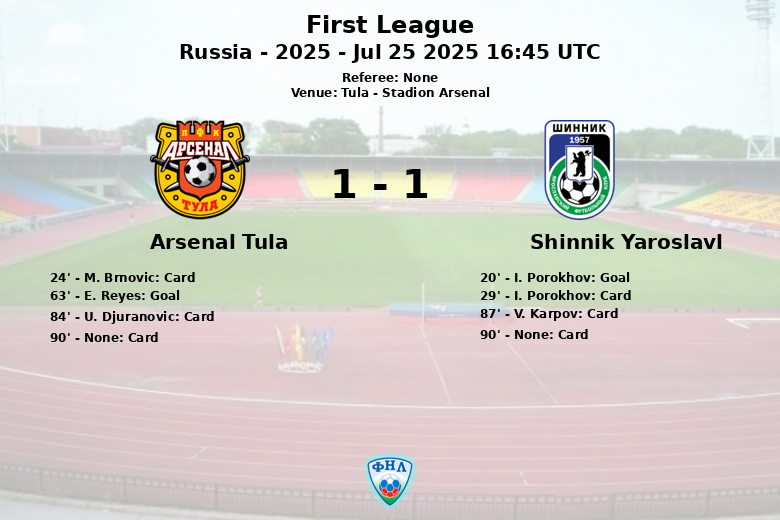 The match was characterized by tactical and contested play, with several cautions for both sides. Arsenal Tula received two yellow cards, while Shinnik Yaroslavl also saw two of its players booked. Despite the intensity, neither team managed to gain total control of the match.