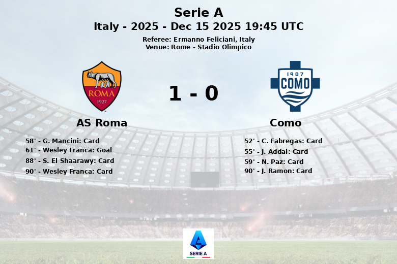 Referee Ermanno Feliciani had his work cut out for him maintaining control of the match, showing yellow cards to G. Mancini, S. El Shaarawy and Wesley Franca for Roma, and to C. Fabregas, J. Addai, N. Paz and J. Ramon for Como. The high intensity of the game translated into 16 fouls committed by Roma and 8 by Como. Despite the defeat, Como proved to be a spirited opponent and fought until the end for a positive result.