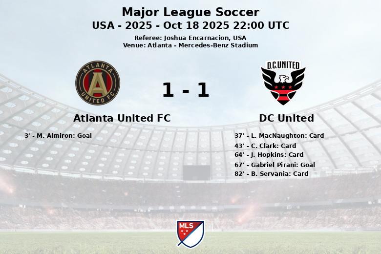 Atlanta, October 18, 2025 – In a hard-fought match at the Mercedes-Benz Stadium, Atlanta United and DC United drew, in a game featuring moments of tension and yellow cards. Atlanta United started strong, opening the scoring in the 3rd minute with a goal from Miguel Almiron. However, DC United responded in the second half, equalizing in the 67th minute through Gabriel Pirani.